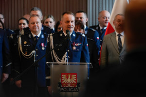 Kolejno głos zabrał gospodarz uroczystości nadinspektor Artur Bednarek. Szef małopolskiej Policji przywitał gości, którzy swoją obecnością zaszczycili dzisiejszy apel. W swoim przemówieniu Komendant podkreślił znaczenie odzyskania niepodległości przez Polskę i wpływu tego wydarzenia na losy przyszłych jak i obecnych pokoleń. ,,Narodowe Święto Niepodległości, to czas kiedy świętujemy naszą wolność ograniczoną jedynie prawem wyznaczonym przez wybranych przez nas ludzi. To wolność posługiwania się ojczystym językiem, dokonywania własnych wyborów, podążania drogą rozwoju. 123 lata niewoli pokazały jak łatwo to wszystko stracić. Kiedy w 1918 roku Rada Regencyjna przekazała władzę Marszałkowi Piłsudskiemu, Polska zyskała nową szansę na rozwój i stworzenie swoich struktur. W okresie międzywojennym mogliśmy wreszcie poczuć, że jesteśmy w swoim kraju i zacząć tworzyć zarówno rząd jak i instytucje, które zapewniłyby bezpieczeństwo obywatelom. Ale ten czas nie trwał długo. II wojna światowa oraz lata powojenne nie dawały szansy naszej Ojczyźnie. Dopiero po 1989 roku mogliśmy tworzyć państwo polskie. Ten czas wykorzystaliśmy bardzo dobrze. To czas osiągnieć, które stawiają nas w czołówce państw europejskich, pod kątem rozwoju, swobód obywatelskich czy bezpieczeństwa. Doskonale wiemy jak ważne dla społeczeństwa jest bezpieczeństwo. Dlatego istotne jest aby każdy z nas - policjantów, pracowników cywilnych, miał świadomość, że poprzez naszą postawę, dyscyplinę przyczyniamy się do budowania poczucia bezpieczeństwa”. Na zakończenie wystąpienia Komendant pogratulował odznaczonym i życzył im dalszych sukcesów zawodowych.
