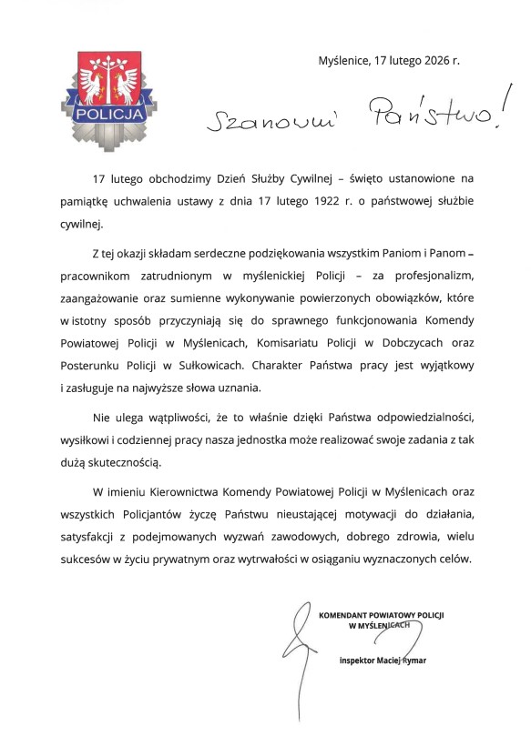 Życzenia Komendanta Powiatowego Policji w Myślenicach z okazji Dnia Służby Cywilnej