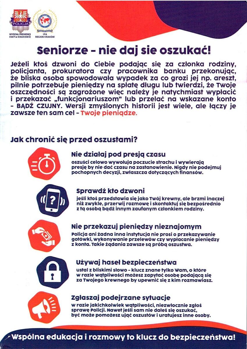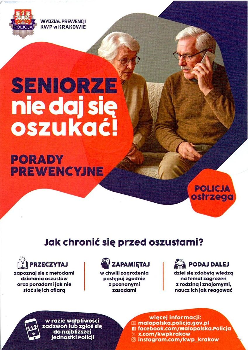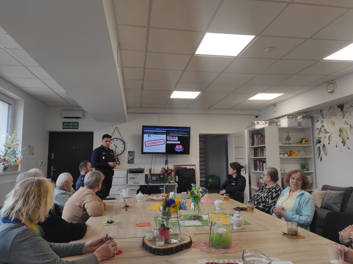 We wtorek, 24 marca br., policjanci Komendy Powiatowej Policji w Myślenicach oraz Posterunku Policji w Sułkowicach przeprowadzili spotkanie profilaktyczne z członkami Klubu Senior Plus w Sułkowicach. W wydarzeniu udział wzięli: dzielnicowa asp. Karolina Łuczak, kierownik posterunku w Sułkowicach asp. Michał Kraus oraz policyjny profilaktyk sierż. Kamila Lepa. Podczas spotkania mundurowi omówili najważniejsze zagrożenia, z jakimi mogą spotkać się osoby starsze. Szczególną uwagę poświęcono problemowi oszustw, które w ostatnim czasie coraz częściej dotykają seniorów. Funkcjonariusze wyjaśniali mechanizmy działania sprawców. Wskazywali, w jaki sposób manipulują rozmówcami, wywierają presję czasu oraz próbują skłonić do przekazania pieniędzy lub poufnych danych. Podkreślano, jak ważne jest zachowanie spokoju w takich sytuacjach, ograniczone zaufanie wobec nieznanych osób oraz natychmiastowe przerwanie podejrzanej rozmowy i kontakt z bliskimi lub Policją Nie zabrakło również informacji dotyczących codziennego bezpieczeństwa, odpowiedniego zabezpieczania mieszkań, właściwego przechowywania pieniędzy i dokumentów oraz zasad postępowania w sytuacjach zagrożenia. Policjanci przypomnieli także o możliwości korzystania z Krajowej Mapy Zagrożeń Bezpieczeństwa jako narzędzia do zgłaszania niepokojących sytuacji w najbliższym otoczeniu. Policyjny profilaktyk przedstawił również rozwiązania wspierające bezpieczeństwo seniorów, w tym program Małopolski Tele-Anioł 2.0. Dzięki specjalnym opaskom bezpieczeństwa osoby starsze mogą w sytuacji zagrożenia zdrowia lub życia szybko wezwać pomoc i nawiązać kontakt z centrum teleopieki.