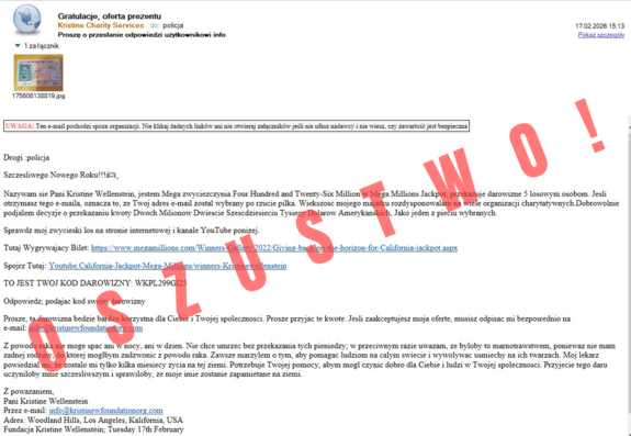 Do skrzynek mailowych trafiają wiadomości informujące o rzekomej wygranej w amerykańskiej loterii i przekazaniu wielomilionowej darowizny. To próba oszustwa. Przestępcy liczą na wyłudzenie danych osobowych i pieniędzy.